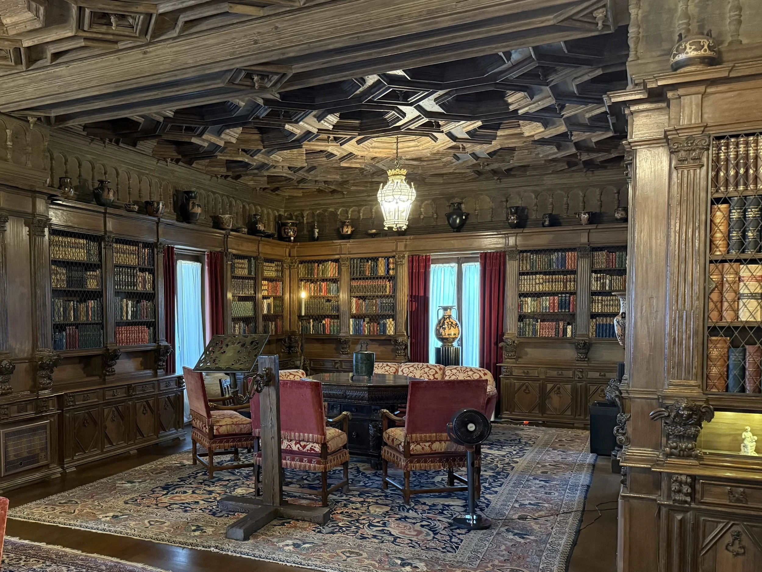 The entire project was overseen by Julia Morgan—the first woman to graduate from the French School of Fine Arts in Paris, and a successful California architect and designer for many decades. She learned about reinforced concrete engineering and construction in Paris; her career received a boost when her buildings didn’t fall down in the 1906 San Francisco earthquake. But the castle was not a single vision; it was a true collaboration between Hearst and Morgan. Because of Hearst’s penchant for changing his mind, the site today is a palimpsest of designs, overwritten on each other. Hearst raided—or, as our tour guide put it, helped inject much needed capital into—post-WWI Europe for fine arts and architecture. He bought statues, ceilings, fireplaces, stonework, furniture, decorations and more, shipping it all to the middle of a 250,000 acre ranch on the California coast. The actual construction of the building is 20th-century reinforced concrete, but all the decorations are imported from old-world artisans. So you end up with a situation like the library shown below: atop all the bookshelves, all around the room, a line of antique Greek vases, 2,000 to 3,000 years old.
